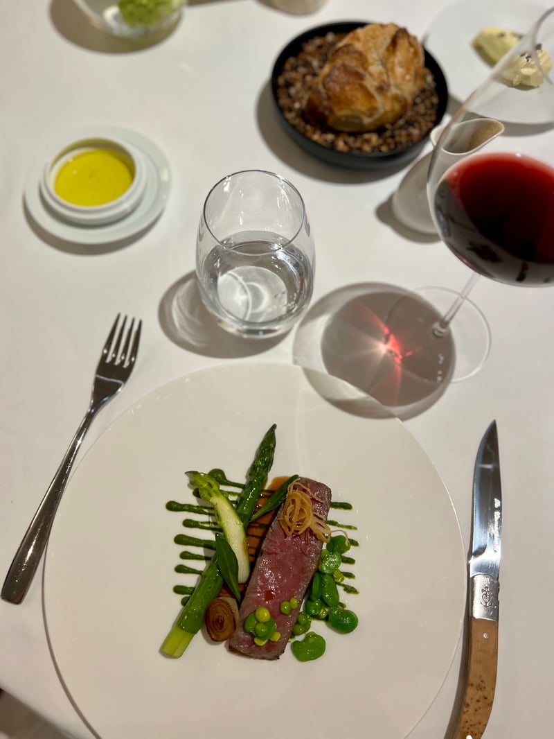 The meal continued with exceptionally tender Wagyu beef, just seared to preserve all its juiciness. Served on a seaweed sauce, this dish played on the duality of power and freshness. Crunchy green asparagus, fava beans, peas, and caramelized baby onions formed a colorful and vegetal harmony, punctuated by fried onion chips. The velvety tannins of the red wine perfectly extended the richness of the dish while highlighting its freshness.