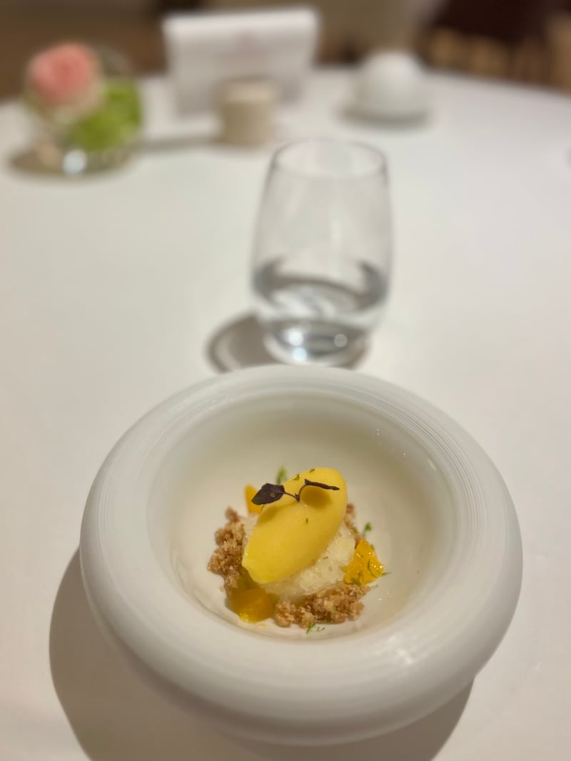After a carefully selected cheese platter, the pre-dessert offered a welcome breath of freshness. A quenelle of orange sorbet rested on a limoncello granita, while pieces of yuzu punctuated the whole with lively, tangy notes. This small interlude, as punchy as it was delicate, subtly awakened the taste buds.