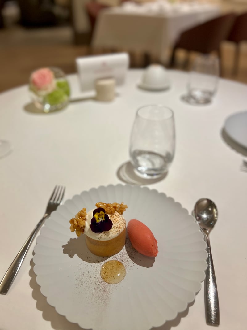 The main dessert played on a note of nostalgic sweetness with a revisited rice pudding. Presented as a perfect cylinder topped with an airy cream sprinkled with caramelized nuts, it evoked childhood memories while elevating them. A strawberry sorbet quenelle with a frank flavor and silky texture balanced the roundness of the rice, while a lime jelly and zest provided just the right dose of acidity. A dessert that was both tender, modern, and perfectly mastered. Finally, a few mignardises: a lemon tartlet with bright, tangy aromas presented as a shiny dome on a crispy sablé, and a praline-hazelnut tartlet with a melting heart, wrapped in a dark chocolate shell. Alongside, small honey madeleines, still warm, extended the sweetness of this exceptional meal.
