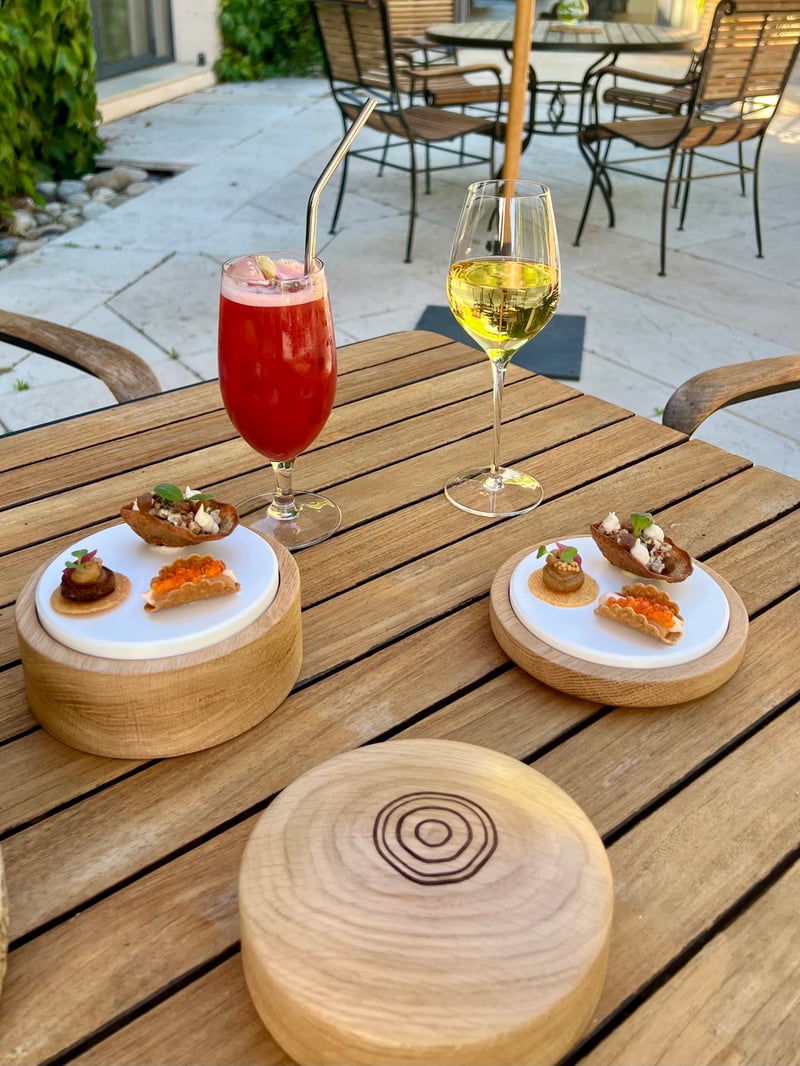 Our culinary journey began on the terrace with a trio of amuse-bouches reflecting the philosophy of the place: finesse, creativity, and local roots. The first bite combined the iodized freshness of an oyster with the roundness of buckwheat, lifted by a hint of smoked andouille for a bold balance. The next, an almond cracker topped with Fumades trout and tarama, stood out for its smoothness and vibrancy. Finally, a sheep's cheese and caramelized onion sablé with mustard seeds offered a rustic yet refined contrast. I chose to accompany these first flavors with a glass of champagne, while my husband opted for a strawberry and lavender mocktail, floral and perfectly balanced.