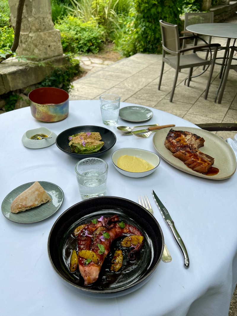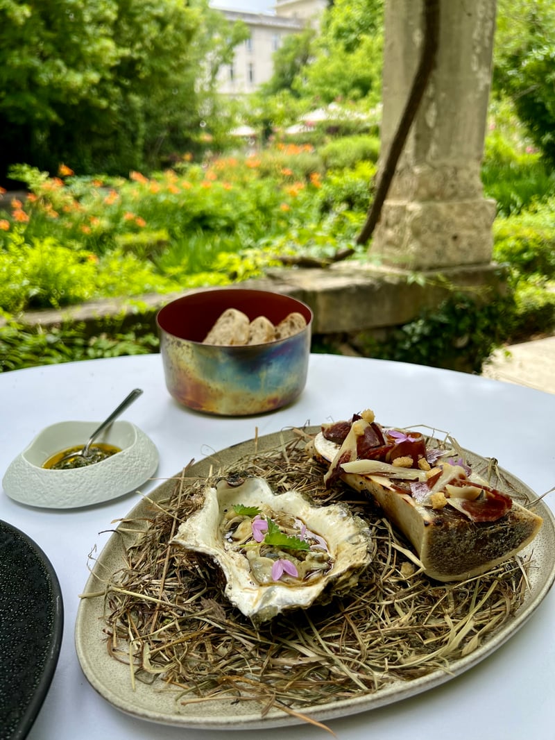Comfortably seated under a canopy draped with jasmine and wisteria, overlooking the organic garden, our lunch at La Petite Table du Prieuré was a gourmet highlight, where apparent simplicity masked true mastery of product and flavor. For starters, pink rockfish gravlax was paired with mango and a fresh herb medley, offering freshness, sweetness, and zest — an elegant and subtle opening. The No. 0 oyster, served warm from the grill, was a delightful surprise: its bold pairing with roasted bone marrow and Iberian ham brought unexpected depth, balancing brine, smoke, and richness.