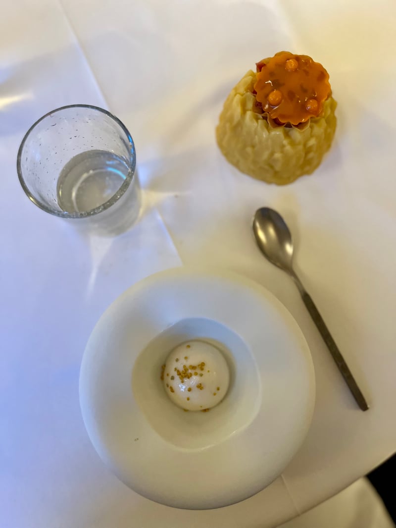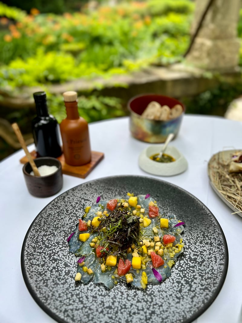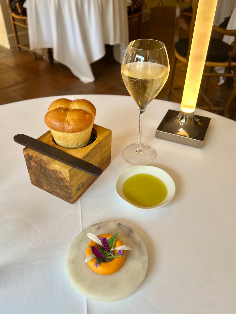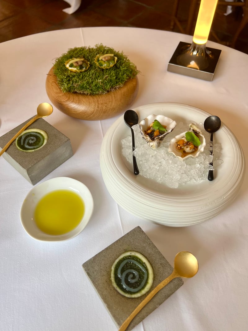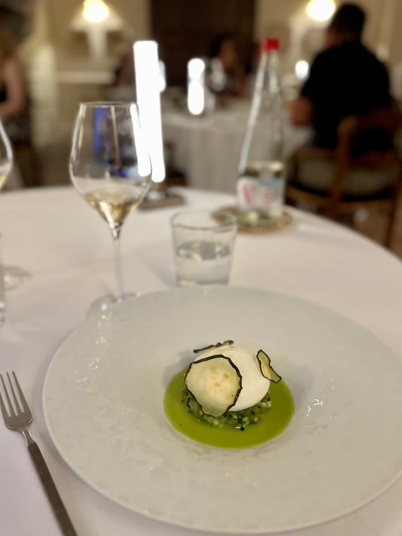 Draped in velvet and open to the garden, the dining room where we sat extended the elegant, intimate ambiance of the property. From the very first amuse-bouche, the tone was set: precision, poetry, and aesthetics. A golden brioche bun was served with delicately smoked butter and fruity olive oil. The Chef's creativity emerged early: a raw oyster with citrus accents balanced freshness and depth, while a spiral of cream and herbs with snails, placed on a stone, accompanied a delicate vegetable tartlet — an homage to nature and the surrounding forest.