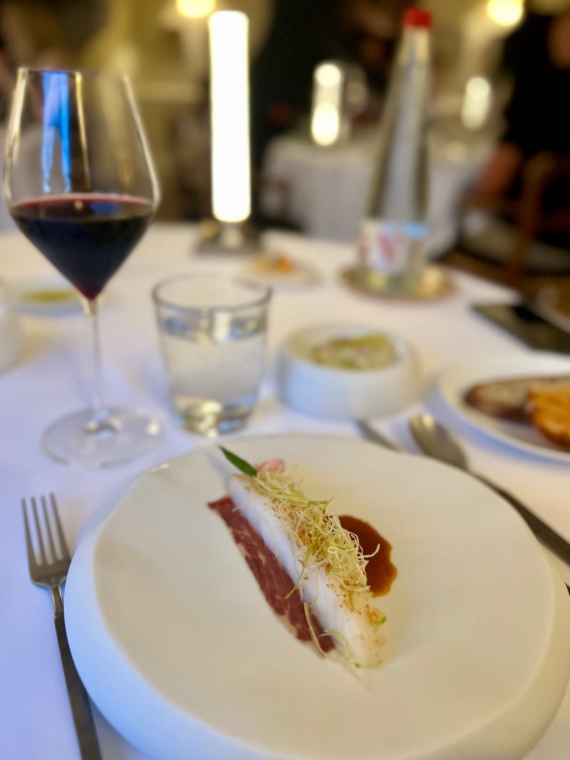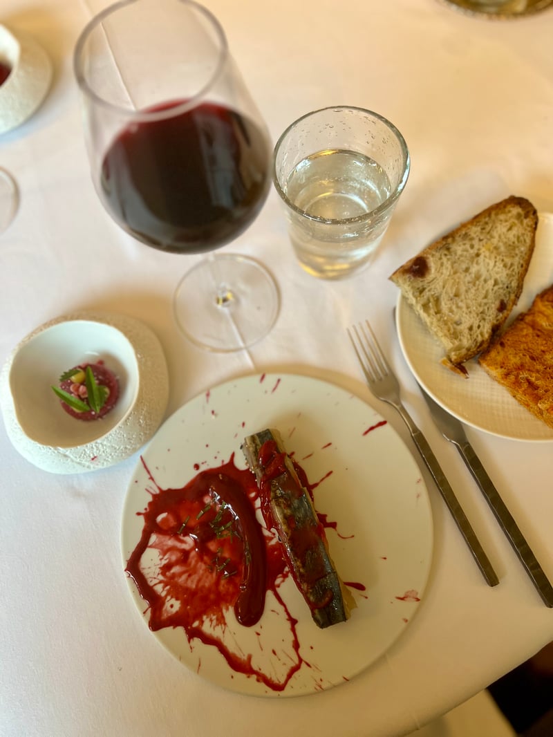 The smoked mackerel dish resembled a graphic composition, where visual appeal rivaled flavor. Presented on a raspberry coulis-splashed plate, the fish's firm flesh was elevated by precise smoking. The fruit's acidity melded with the subtle warmth of ginger, while a chilled Tabasco condiment added a discreet but effective kick. Each bite oscillated between tension, freshness, and depth in a raw, elegant, and modern dish.