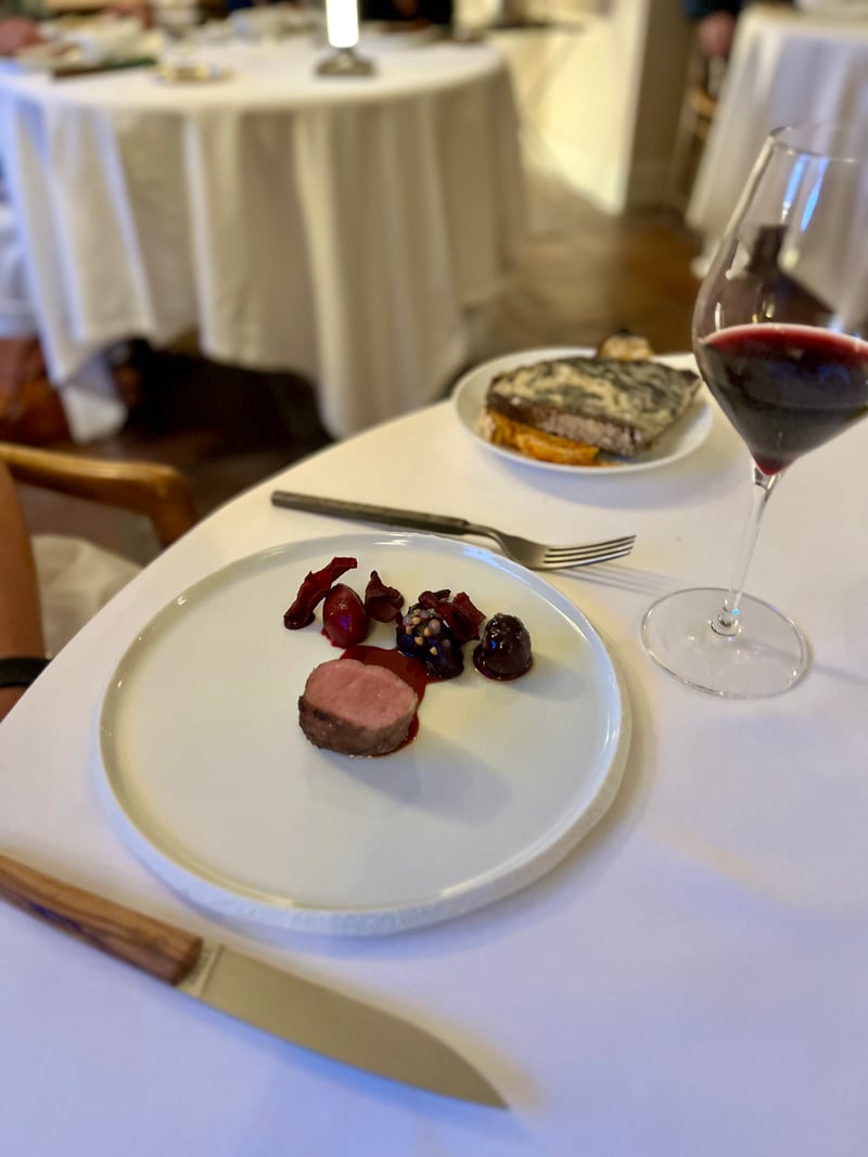 The lamb was a masterclass in harmony and technique. Pink in the center, the meat was tender and flavorful, highlighted by a glossy, powerful jus. The accompaniments played with texture and taste: a beet bonbon with earthy sweetness and striking visuals mirrored the lamb's flesh, while a cherry, both tart and fruity, added bright contrast. A dish at once bold, delicate, and deeply satisfying.