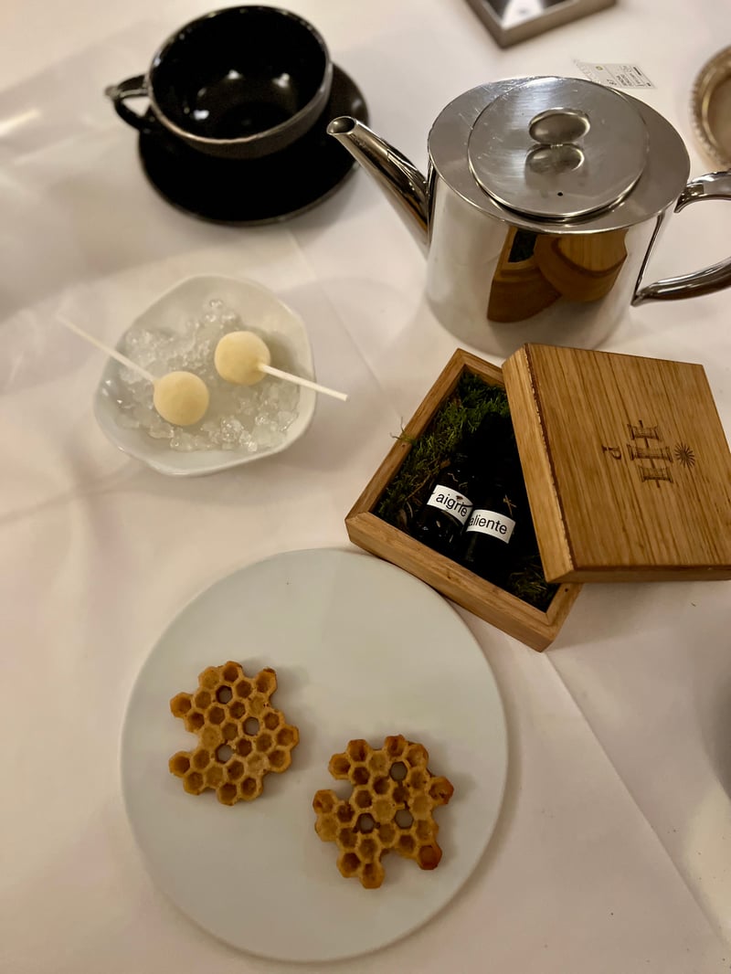 The mignardises extended the experience with the same precision and poetry. Two iced lollipops offered a final refreshing, playful, and elegant touch. Alongside, two golden honeycomb-patterned cookies delighted both in look and crunch. Finally, two mysterious little vials allowed guests to flavor the cookies as they wished. A sweet, original conclusion in perfect harmony with the spirit of the house.