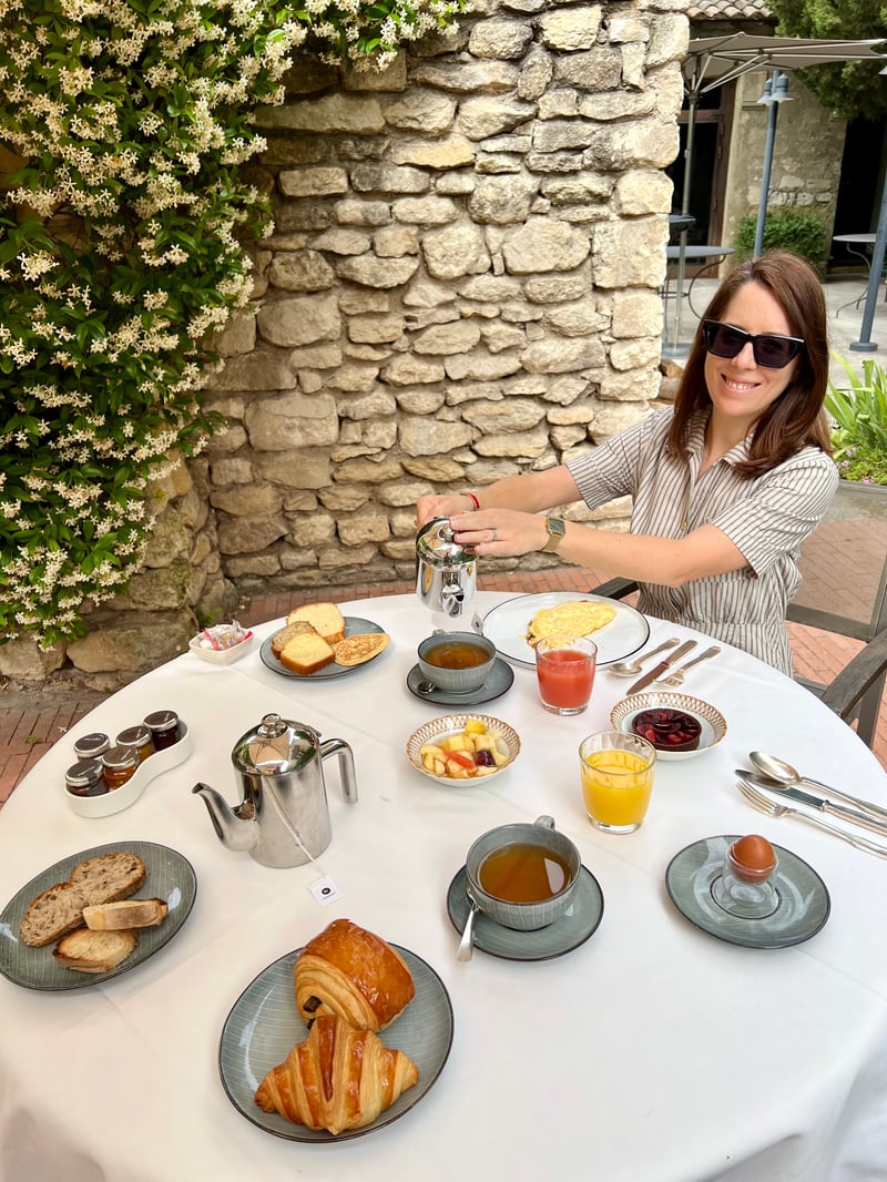 Seated on the terrace, surrounded by authentic stone and blooming jasmine, we enjoyed a refined and generous breakfast. Golden pastries, fresh bread, homemade cakes, and fruit tartlets were joined by a beautiful array of artisanal jams. Eggs cooked to order and a fresh fruit salad completed this morning feast, accompanied by fresh juice and elegantly served tea. A gourmet moment of simplicity and sweetness in the peaceful morning light.