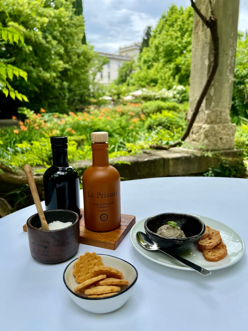 In the evening, the atmosphere shifts: welcome to the hushed, refined setting of the Michelin-starred restaurant Le Prieuré, where Chef Christophe Chiavola's talent shines. A native of Savoie trained in Provence, he was awarded a Michelin star in 2024. His approach is instinctive, personal, and deeply respectful of the ingredients. His cuisine, inspired by the seasons and Provençal terroir, marries Mediterranean and floral notes, always finished with a signature touch of acidity. The dishes explore land and sea with unexpected but expertly mastered pairings. Everything is crafted to spark surprise, delight, and emotion—without excess or artifice.