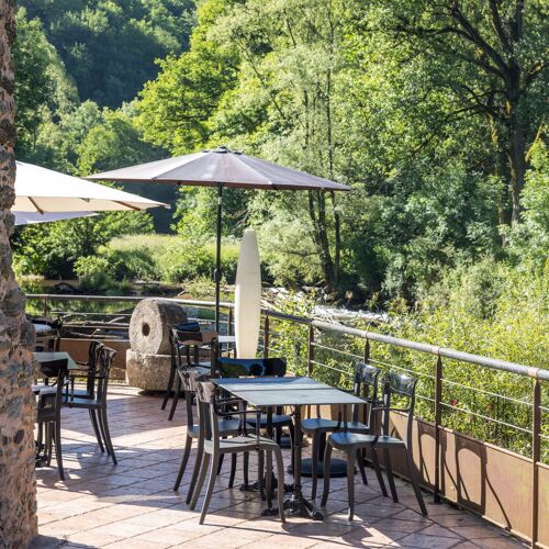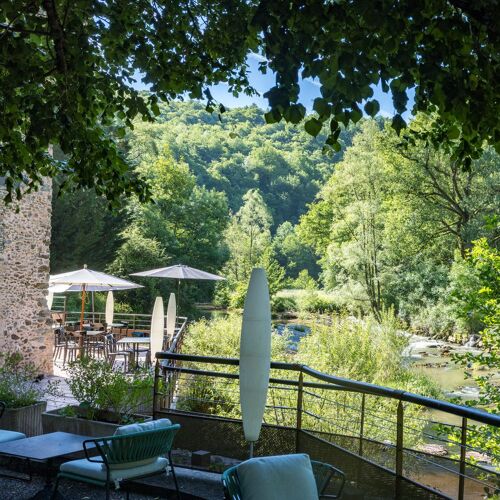A converted stone mill on the riverbank provides the setting for Émilie and Thomas Roussey's one-starred table. Both chefs trained under Pierre Gagnaire, Michel Bras, and Alain Ducasse before establishing their own kitchen here, where exposed rafters frame picture windows overlooking the water. Their natural cuisine strips dishes to essential ingredients—tomato and basil, aubergine with agastache—sourced from local producers and served at peak freshness.