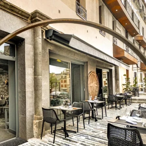 Gilles Moreau's elegant dining room channels the Aubrac terroir with creative precision. The menu builds around regional essentials—beef paired with aligot and a red wine-shallot reduction, organic mountain trout lifted by bacon foam and Vieux Rodez risotto, free-range guinea fowl enriched with black trumpet mushrooms. A tranquil rear terrace extends the experience in warmer months, suited to unhurried afternoon meals.