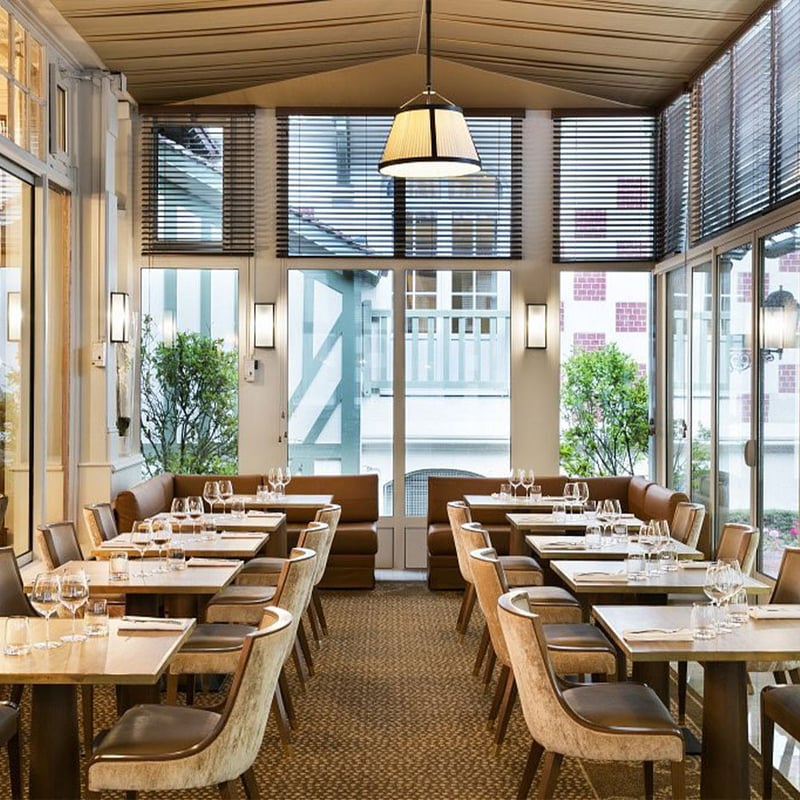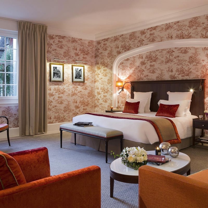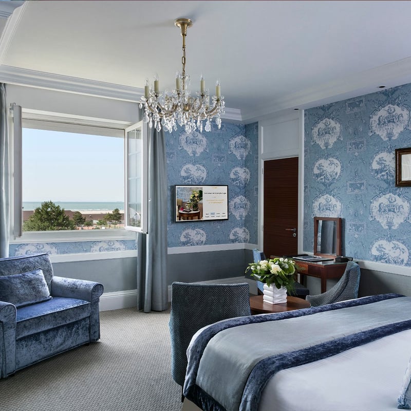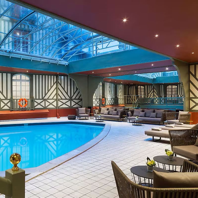 The green half-timbered façade of this 1912 Anglo-Norman palace opens onto a sprawling Barrière resort connected by tunnel to the casino, with an Italian-style theater and 25 dining venues. Families find comprehensive programming: Studio by Petit VIP club, Teen's Camp, and a nursery from ten weeks, plus Bonpoint spa treatments. The Belle Époque restaurant serves Norman terroir cuisine under crystal chandeliers, while the English club bar pours from a 147-whisky collection. An indoor pool under glass roof adjoins Spa Diane Barrière's thalassotherapy, hammam, and Biologique Recherche protocols.