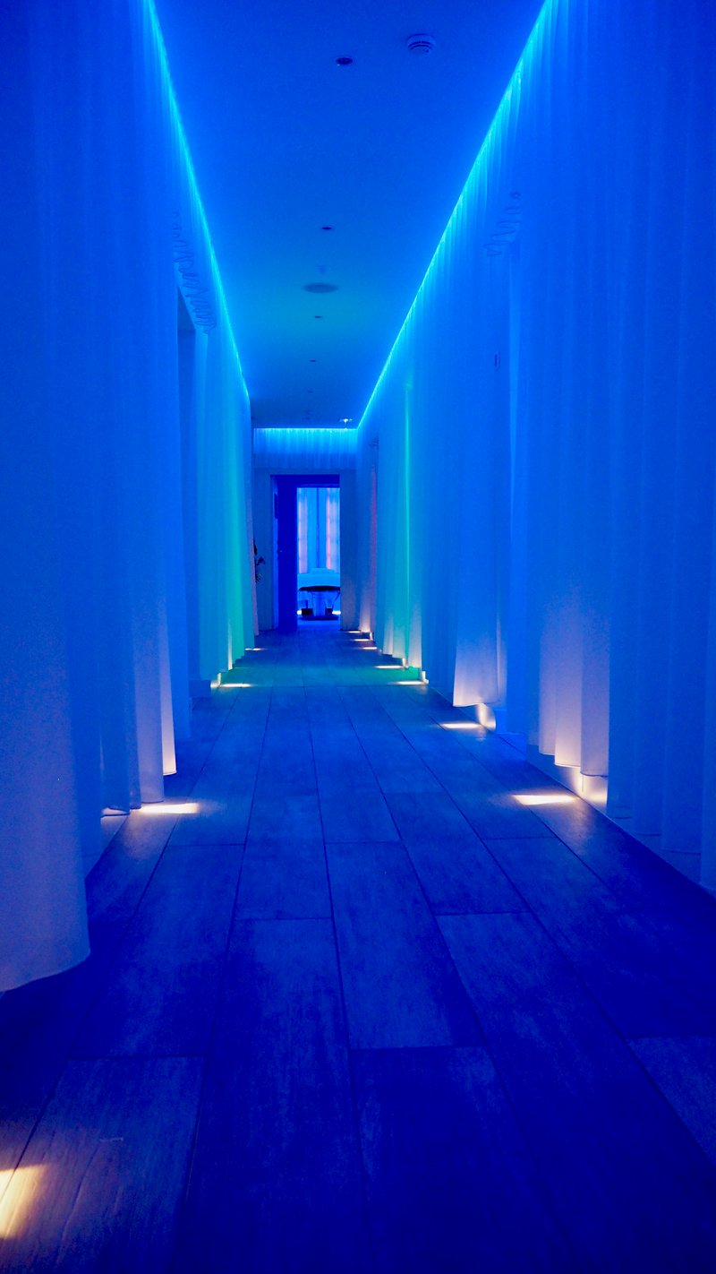 Comfortably settled in the sitting room, I wait for my therapist, who comes to offer me a warm welcome and explain the basics of my treatment while accompanying me to my room. We enter into the heart of the spa, a long, super-futuristic hallway using color therapy, and the contrast is striking! I arrive in one of ten rooms where the treatments are administered and lie down on my AerialBed, a unique kind of treatment table which turns out to be very comfortable (particularly the face cradle, which is often rather unpleasant).