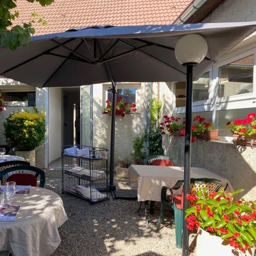 Regional Jura flavors anchor the kitchen at Les Jardins Fleuris, where dishes like venison terrine with foie gras and rabbit tournedos with mushroom duxelles and morel-enriched beef jus demonstrate confident terroir cooking. A frozen soufflé perfumed with Marc d'Arbois provides a fitting finale. The rear terrace offers a leafy retreat, and the welcome remains genuinely warm throughout.