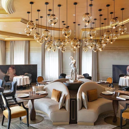 Perched on the Champagne hillsides between Reims and Épernay, this one-Michelin-starred table occupies a striking modern amphitheatre carved from pale stone. Beneath a gilded ceiling crowned by thirty-six blown-glass orbs—a nod to the region's famous bubbles—the kitchen delivers refined haute cuisine rooted in classical French tradition. Napoleon once paused at this former coaching inn; today's guests linger over seasonal menus paired with an exceptional champagne cellar.