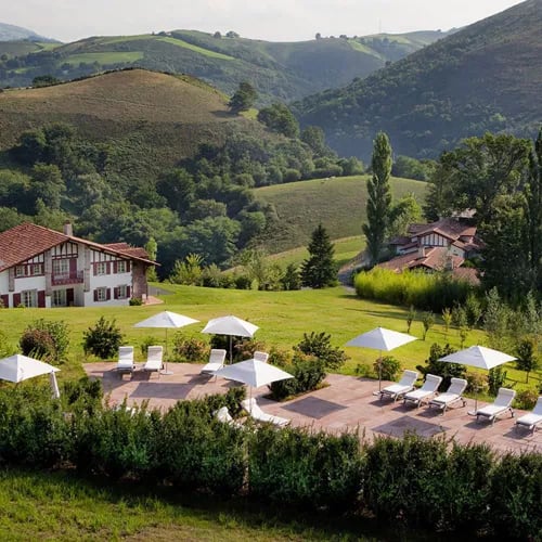 A seventeenth-century Basque farmhouse collides with a bold modernist cube in the countryside near Saint-Jean-de-Luz, facing La Rhune and the Pyrenean foothills. Chef Cédric Béchade, trained under Alain Ducasse, runs a one-Michelin-star kitchen centered on flame-cooked regional produce. Twelve rooms dressed by Belgian brand Flamant pair weathered textures with clean contemporary lines; a heated outdoor pool and celebrated Sunday brunch complete this eco-conscious retreat for gourmands seeking calm.