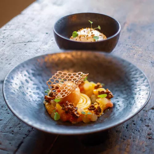 A former fishmonger's shop turned intimate dining room, Terrae wraps guests in terracotta warmth and pale wood elegance. Chefs Grégory Ménard and Lucile Voisin craft menus dictated by local harvests—Pyrenean trout marbled with squid ink and beetroot pickles, Kintoa pork paired with artichoke variations. Hand-forged Basque silverware and regional ceramics dress each table, extending the terroir philosophy from plate to place setting.