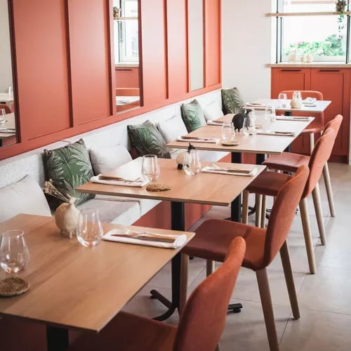 A love story turned culinary venture: Manon Grasset and Adrien Layssac, who met in Alain Ducasse's Provençal kitchen, now cook side by side in this Cambo-les-Bains bistro. A decade immersed in Basque terroir shapes their seasonal market cuisine—local lamb paired with asparagus and bagna cauda, vibrant vegetable compositions, citrus desserts bright with heather honey. White beams and a bold blue wall frame the intimate dining room.