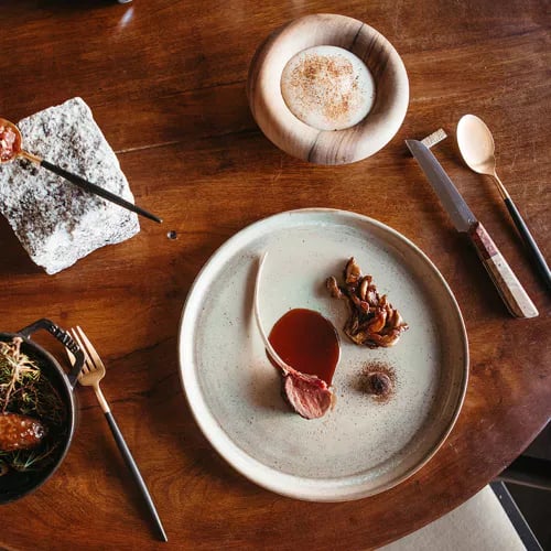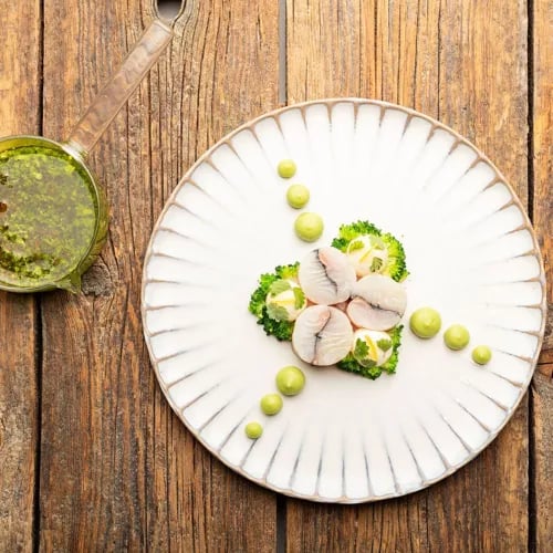 A family-run address near Lake Geneva, Baud draws from the alpine larder of Savoie to compose its modern repertoire. Trout from local waters arrives poached then chilled, paired with tarragon pesto and herb emulsion, while Muscovy duckling meets celeriac and Roscoff onions beneath a crimson-ceilinged dining room. Summer meals migrate to the riverside terrace, shaded by a pergola overlooking the water.