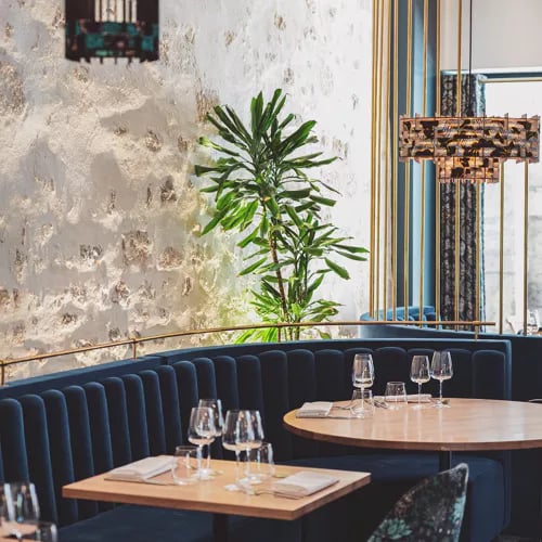 Exposed stone walls and velvet banquettes in peacock blue create an intimate backdrop for Arco's vegetable-forward cooking, where unexpected pairings—green asparagus with liquorice, line-caught sea bass with olives and anchovies—reveal a kitchen unafraid of bold combinations. The rear patio terrace adds charm for warmer months, while two distinct formats serve the occasion: a focused lunch menu or more elaborate evening compositions.