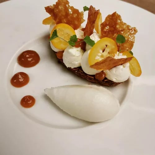 Corentin Courtien and Madeline Blais shape a menu that shifts with the occasion: approachable bistronomy at midday, more ambitious tasting sequences come evening. Eighty percent of ingredients arrive from regional growers, then meet spice-forward technique—bluefin tuna paired with anise hyssop oil, green beans, and lacto-fermented blackberries illustrates the precision. The dining room near Église Sainte-Jeanne-d'Arc remains intimate, service warm, and every plate reveals careful calibration of bold, contrasting flavours.