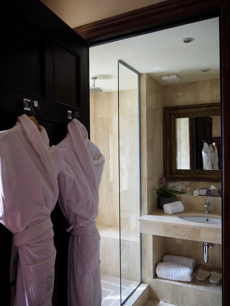 The rooms and suites here each have a unique style and feeling. They are perfectly integrated into the old building, and most of them feature a few visible stones. My stay will be in the Deluxe “Eza” room, which absolutely sweeps me off my feet; it's the former library of the prince of Sweden, and you can still see some of his books on the shelves. The wood paneling has also been preserved, enhanced by antique furniture, a fireplace, and high-quality natural materials: we're immediately transported back several centuries, much to my delight! But the highlight is without a doubt the balcony, which offers an extraordinary view of the coast. It's impossible to lose interest – the scenery is almost unreal. As for the bathroom, it's certainly not very spacious, but the window offering a view of the sea from the shower easily makes up for that.