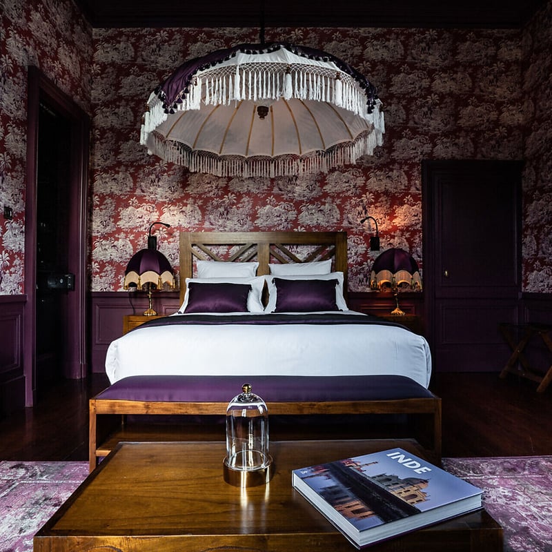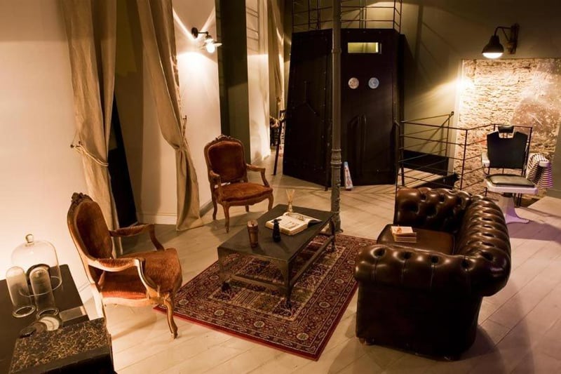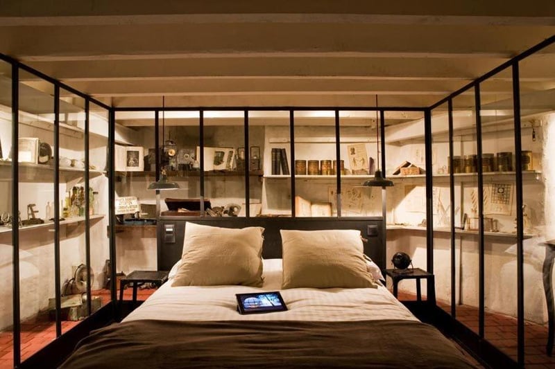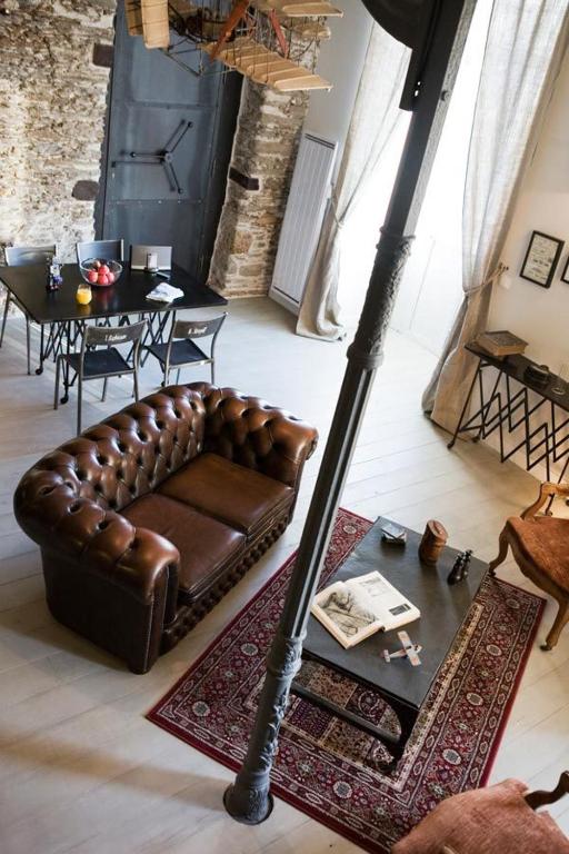 This nine-suite boutique pays homage to Jules Verne through architecture that fuses industrial heritage with literary fantasy. A suspended bed accessed by wrought-iron ladder anchors the Voyage in a Balloon room, while shipping containers define the Extraordinary Voyage space and a spaceship-inspired bathroom equips the From the Earth to the Moon suite. One apartment occupies a 1930s riverboat moored at Quai Henri Barbusse, offering Loire River views matched by the majority of rooms in the main loft-like building.
