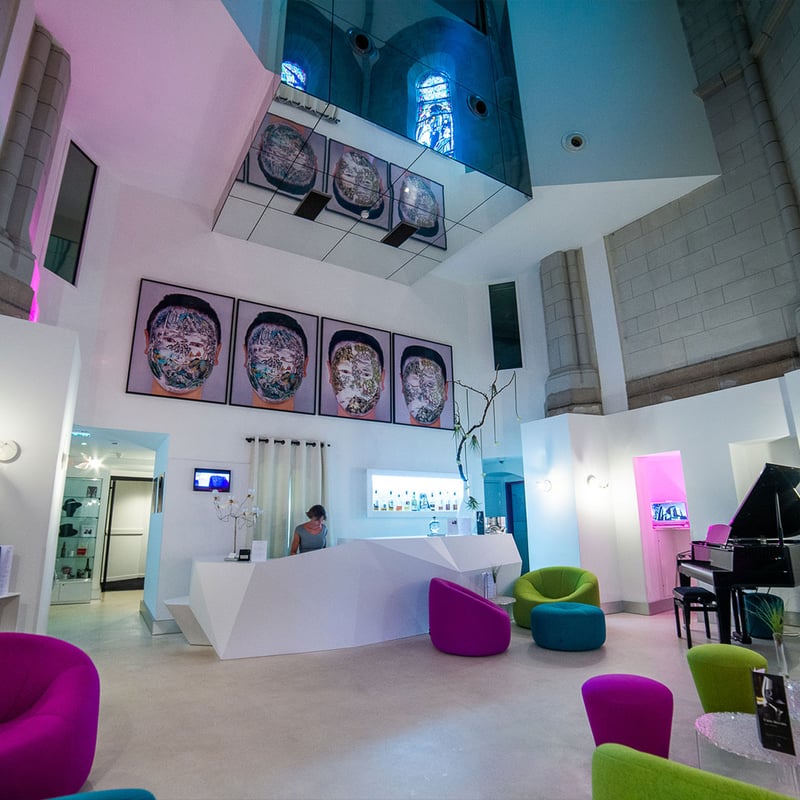 A 19th-century chapel conversion grants Sozo its theatrical scale: vaulted ceilings soar above the lobby, while original stained glass and exposed stonework define guest quarters. The wellness facilities—hammam, sauna, ice room, sensorial shower—occupy generous square footage, and whimsical neon furnishings inject levity into the ecclesiastical shell. Twenty-four rooms split between chapel and sacristy wings, walking distance from Château des Ducs de Bretagne and the cathedral.