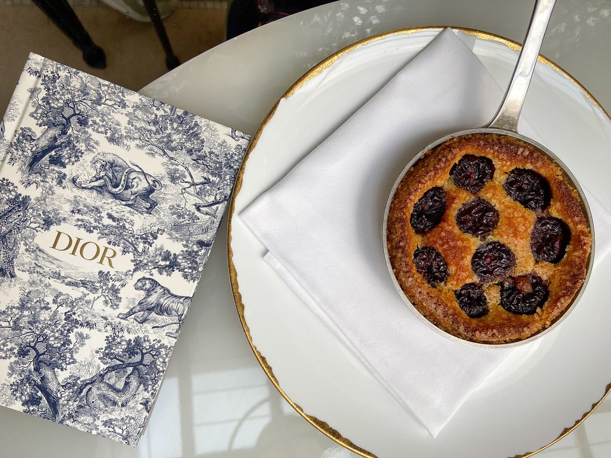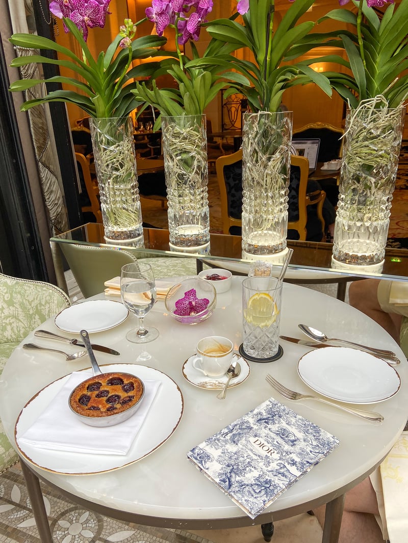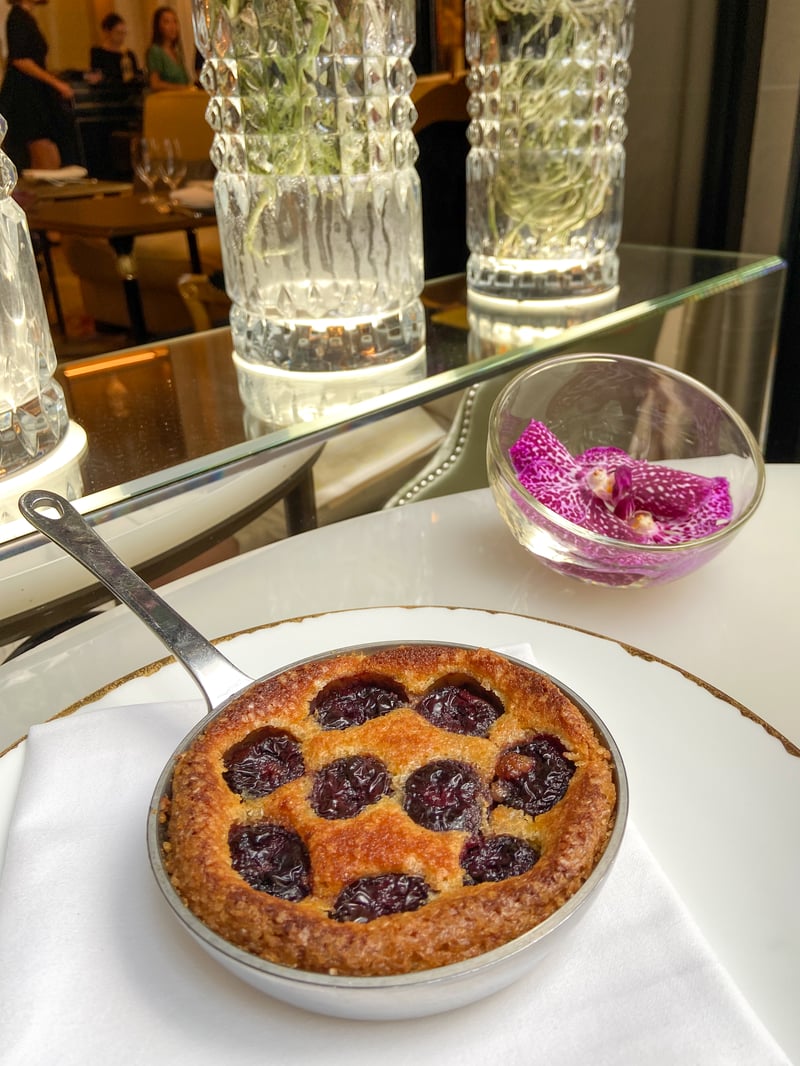 Today, he delights us at the Four Seasons Georges V within La Galerie with its superb 19th-century inspired decor. I loved the cherry and fresh almond clafoutis, accompanied by an espresso. As for the look, I'm in love: we opted for the glass roof to enjoy the beautiful light while staying cool (in August, the capital often reaches 35°C!). In this prestigious and absolutely stunning environment, the moment seems suspended!