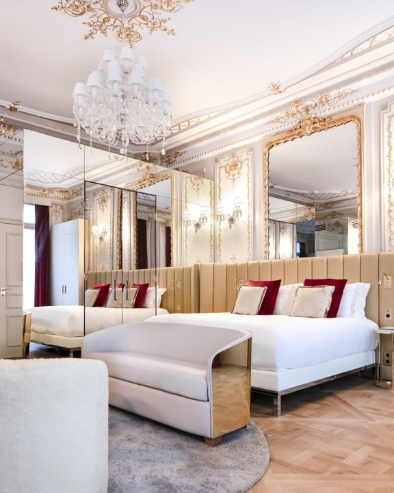 In the hotel's 48 rooms and 5 suites, the style of the Haussmannian apartment with modern comforts continues. The solid wood parquet floor and crown molding juxtapose Maison Charles lamps and designer furniture, such as golden and chrome-colored armchairs, leather-covered headboards, and console tables that mix brass and marble. As for the bathrooms, they're arranged like dressing rooms, completely made of marble and featuring heated floors. The smallest room category starts at 21 to 24 m², while the top-of-the-line Bowmann Suite covers 100 m². The suite includes an equally large terrace with a panoramic view of Paris, and a jacuzzi to top it all off!