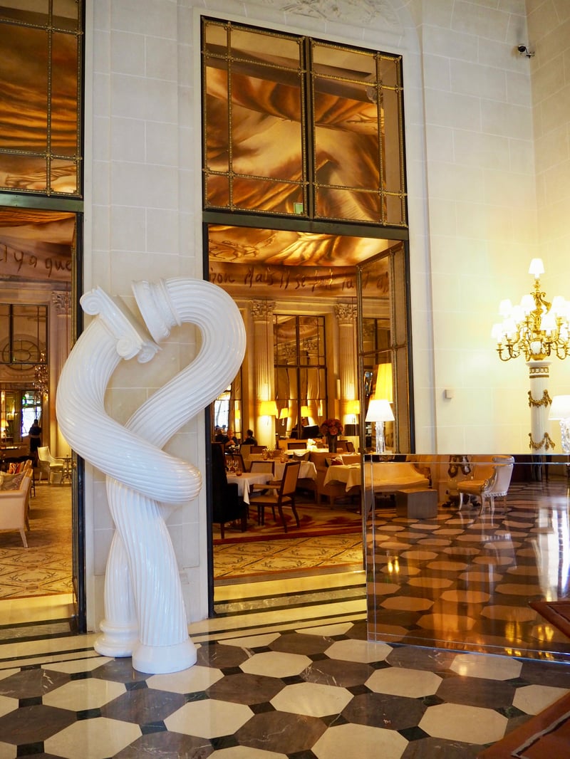 The address is tempting: right in the heart of Parisian bustle, on the famous Rue de Rivoli next to the Tuileries Garden. One could hardly dream of a better location in Paris (except maybe the Hôtel de Crillon nearby). Inaugurated in 1835, this first Parisian palace is part of French historical heritage. The past meets the present here: a subtle mix between the opulent 18th-century style and modern touches, thanks notably to Philippe Starck's redesigning of the dining and bar areas in 2007, and again in 2016. Upon entering, we were immediately greeted by this ingenious blend of styles with a large contemporary sculpture that perfectly integrates with the more classic architecture.