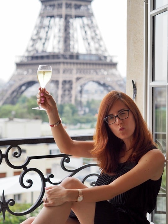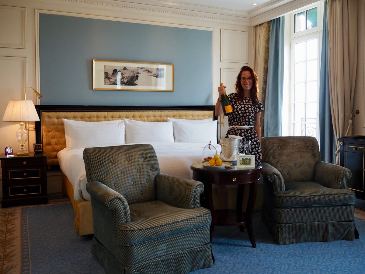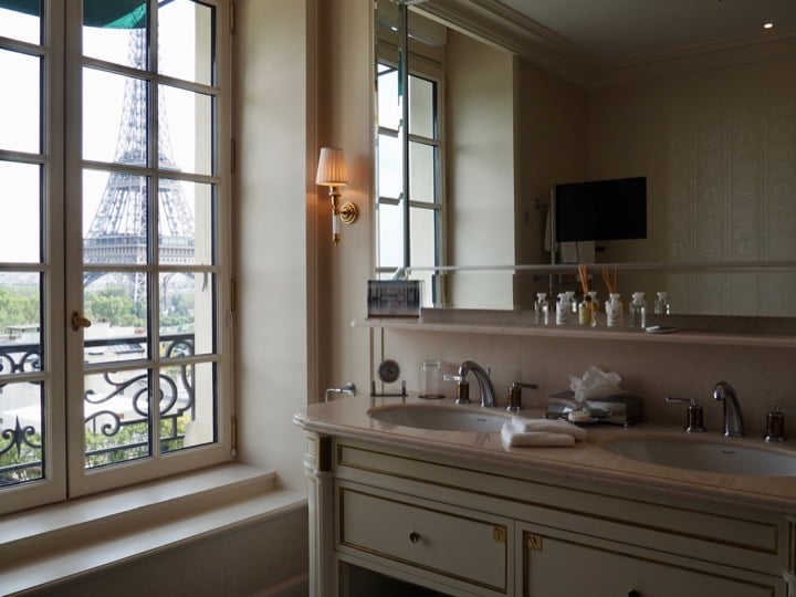 Time to discover my Eiffel view room. It features French interior design with pale tones and an abundance of natural materials such as the marble bathroom. And it is pure bliss to be so close to the city's most emblematic monument. I couldn't take my eyes off it, especially before dinner when we enjoyed a glass of Veuve Clicquot champagne, or when I was splashing around in the bath!