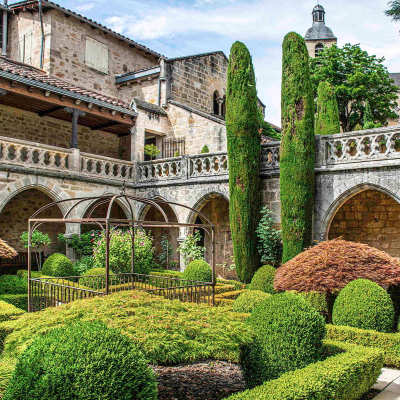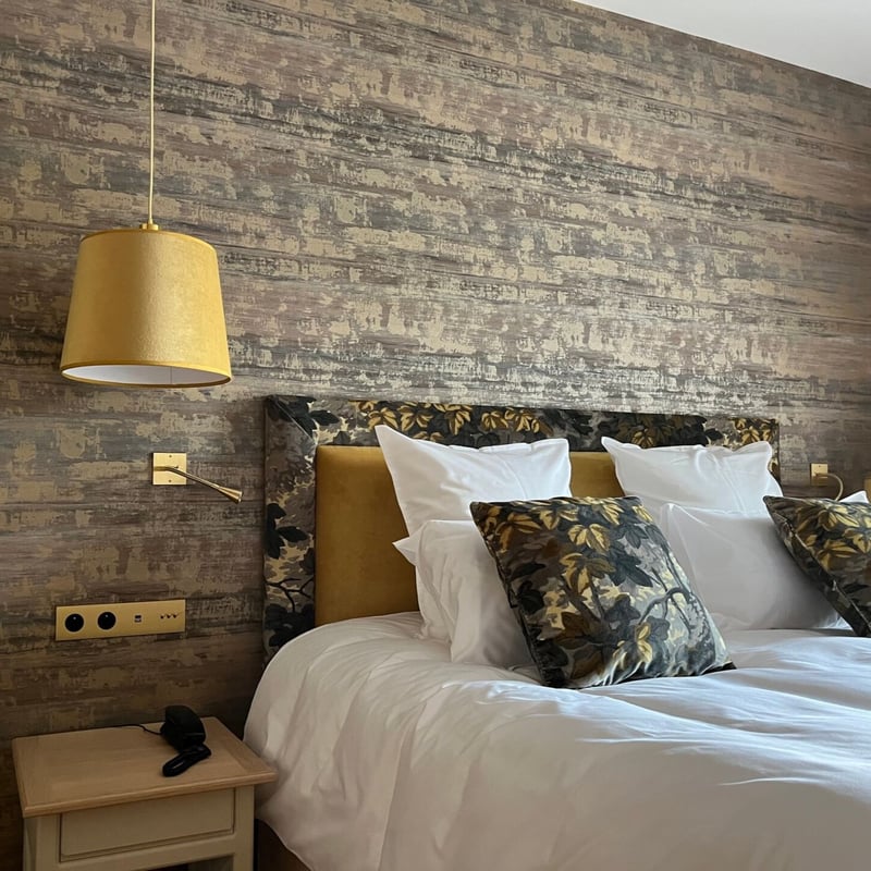 A former private residence converted into a 21-room boutique hotel, this Figeac address channels literary nostalgia through antique writing desks, calligraphy murals, and reading lamps that invite long evenings with a book. Stone and wood details anchor the rooms, while toile wallpaper adds provincial charm. A seasonal pool and terrace offer summer respite; complimentary bicycles encourage exploration of the medieval riverside streets beyond.