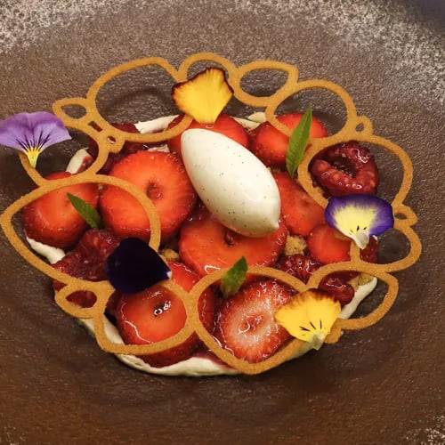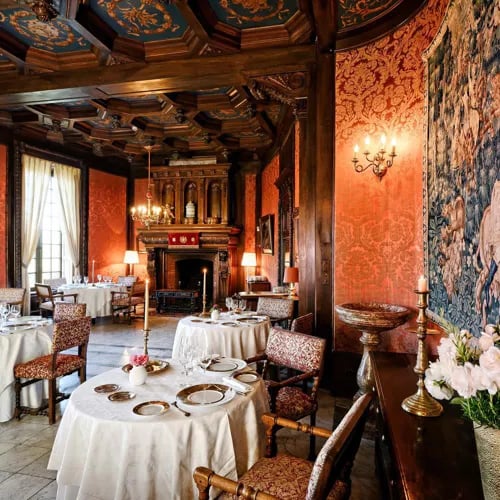 A 14th-century château whose towers seem to hover above the Dordogne provides the theatrical backdrop for Stéphane Andrieux's one-Michelin-starred cuisine. After nearly twenty-five years at the stoves, Andrieux commands Quercy's larder—lamb from the Causses, local foie gras—while pastry chef Marc Jean, present since 1995, closes meals with his strawberry-meadowsweet shortbread. The Grand Louis XIII Salon, with its coffered ceiling and carved fireplace, suits celebration; the riverside terrace, contemplation.