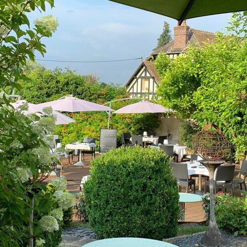 Behind a traditional half-timbered Norman façade, L'Auberge de la Pomme surprises with a sleek contemporary interior flooded with natural light. Floor-to-ceiling windows frame garden views while the kitchen celebrates regional producers—Normandy scallop carpaccio, poached monkfish dressed with watercress from nearby Cailly-sur-Eure, slow-cooked farm veal. A refined country escape minutes from Rouen.