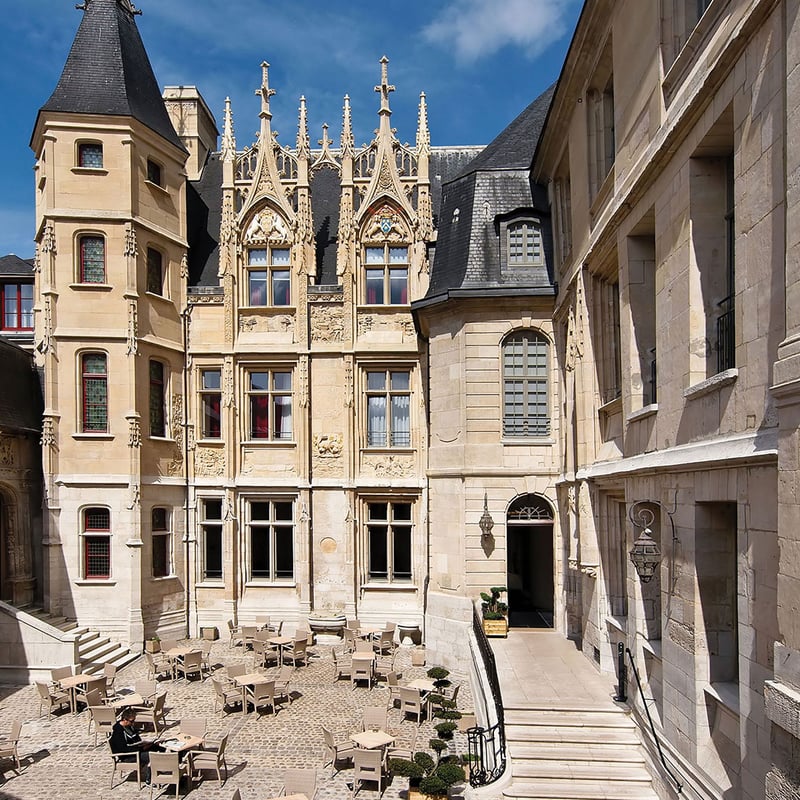 A 16th-century townhouse turned boutique hotel, Hôtel de Bourgtheroulde preserves its original timbered ceilings and antique woodwork while concealing a thoroughly modern spa underground—its pool lit dramatically through an atrium skylight, complemented by sauna, jacuzzi, and Turkish bath. The interior courtyard with its striking turret offers an atmospheric setting for evening cocktails, while Restaurant d'Aumale delivers contemporary cuisine in sleek contrast to the historic surroundings.