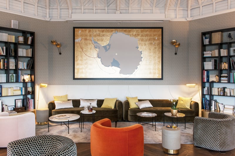 Let's talk about the Charcot lounge, where we're comfortably seated. This exact location was formerly the office of Jean-Baptiste Charcot, the famous explorer who co-founded the marine station. The room is both elegant and inviting, and I'm enchanted by a large painting that recounts Commander Charcot's Antarctic expeditions, and by the impressive collection of books for guests to browse. As I mentioned earlier, the central theme of this place is without a doubt its unique history.