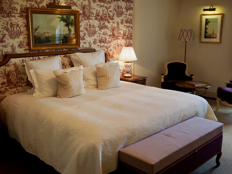 The bedroom, featuring toile de Jouy patterns and Louis XV armchairs, is spacious and very comfortable, as is the marble bathroom. Of the 92 rooms and suites, the suites category is of course more luxurious, but the smaller rooms are also remarkably charming, with comfort worthy of a five-star hotel. Don't forget, we're in an establishment under the famous Relais & Châteaux brand name!