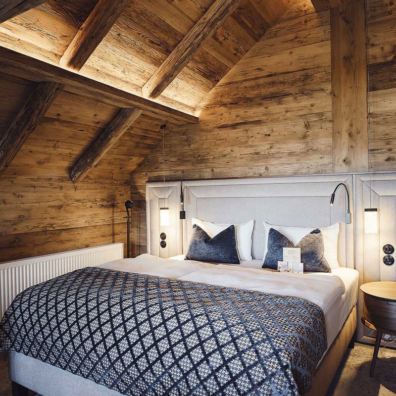 Perched over 4,000 feet high beside Germany's oldest castle ruins, this family-run sixteen-room retreat commands sweeping views across the Allgäu Alps. Interiors lean into mountain chalet aesthetics—oak floors, knotty pine walls, exposed beams—while one suite surprises with Moroccan arches and clay finishes. The spa, warmed by multiple fireplaces and a Finnish sauna, opens onto a wooden deck facing the peaks.