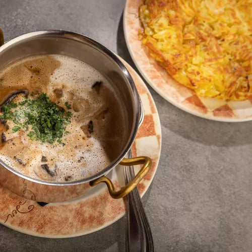 The Bernhard family brings Graubünden heritage to this rustic Oberaudorf address, where Swiss classics share the menu with Bavarian seasonal cooking. Züri Gschnätzlets—veal strips in cognac-laced mushroom cream over hand-pressed rösti—anchors a repertoire that draws loyal regulars. Lunch specials change daily; summer opens up terrace seating on the central Marienplatz. Attentive family service throughout.