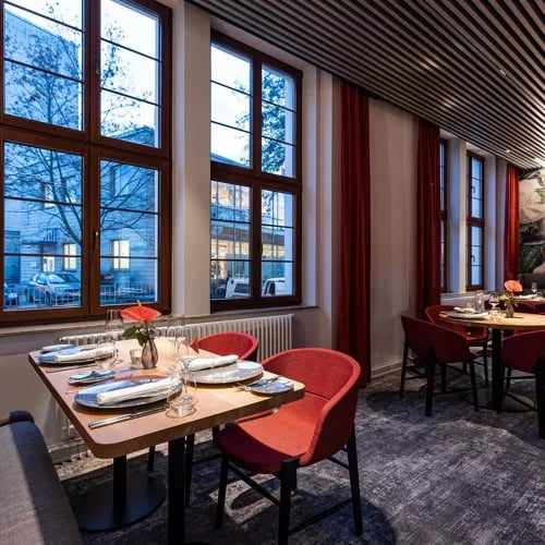 A restored Wilhelminian-era building provides the elegant backdrop for Michaelis, where creative cuisine follows the seasons through thoughtfully composed set menus and à la carte offerings. Vegetarian guests find equal consideration in dedicated tasting options. Service strikes a balance between polish and warmth, while summer months reveal a leafy rear terrace—a quiet retreat from Leipzig's streets, shared with the hotel bearing the same name.
