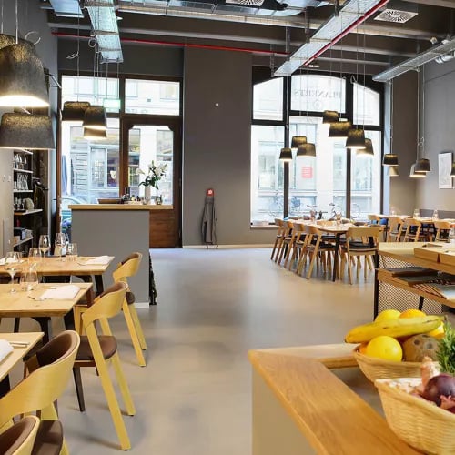 Floor-to-ceiling windows frame an open kitchen where chefs craft modern interpretations of French classics—Bresse chicken with morels and vin jaune, sea bass paired with root vegetables and potato croissant. Two set menus, one vegetarian, showcase dishes accompanied by an exclusively French wine selection, presented tableside with charming cartographic flair. The adjoining shop allows guests to take favored bottles home.