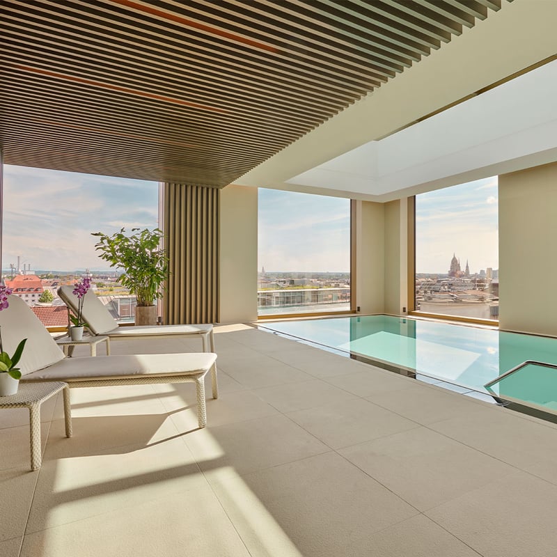 A former palace where King Ludwig I once hosted royalty, Bayerischer Hof channels 337 rooms through wildly varied aesthetics—Art Deco by Siegward Graf Pilati, Bavarian traditionalism by Hans Minarik, English florals by Laura Ashley. The rooftop Blue Spa, designed by Andrée Putman, offers pool and sauna with city views, while the two-Michelin-starred Atelier anchors four restaurants and five bars below.