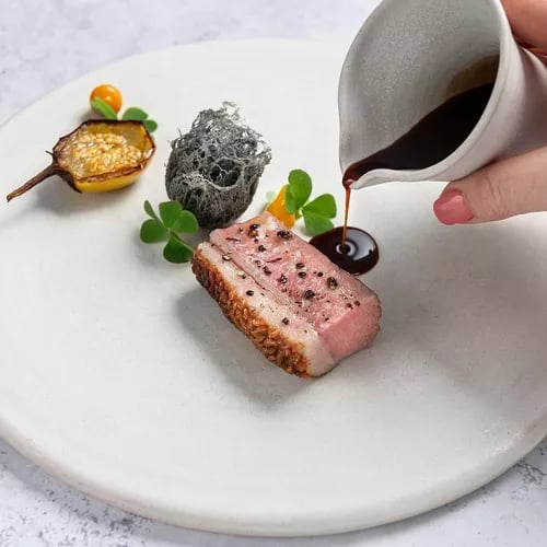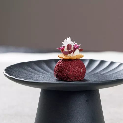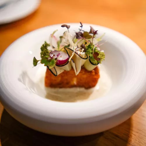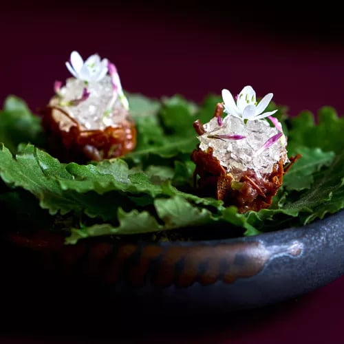 Behind Tantris's striking 1970s façade—all lobster red and truffle black—Chef Benjamin Chmura delivers two-starred Classic French cuisine defined by masterful textural contrasts and unexpected bursts of acidity. His charcoal-grilled pigeon arrives with a red berry sauce of remarkable depth, preceded by house bread served with exclusive small-batch Brittany butter. Seven-course menus pair with rare cellar wines poured by the glass.