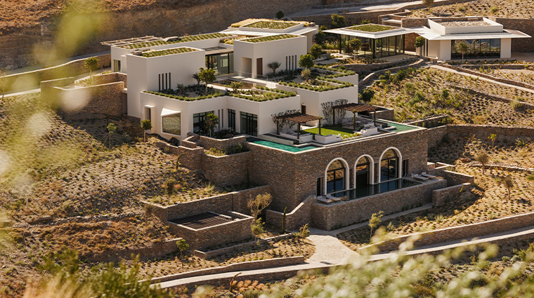 Perched on Aleomandra's hillside with 360-degree views stretching from Delos to Tinos, Kalesma arranges its 25 suites like a whitewashed Cycladic village. Each suite opens onto a private heated infinity pool, outdoor shower, and sunken bath, while interiors showcase Rick Owens furnishings crafted exclusively for the property. The Dr. Barbara Sturm spa and Pere Ubu restaurant complete an address suited to families and couples seeking refined seclusion.