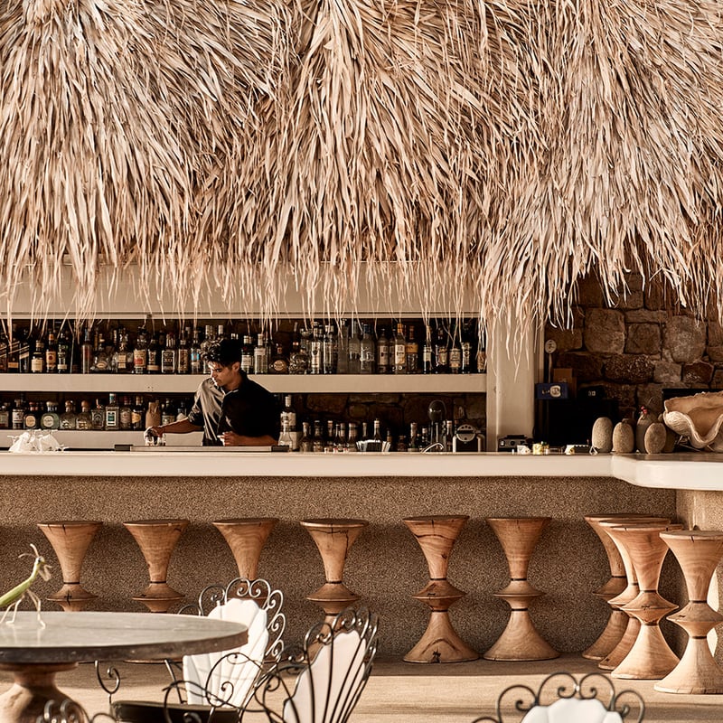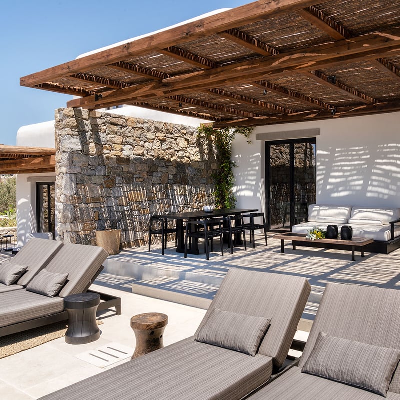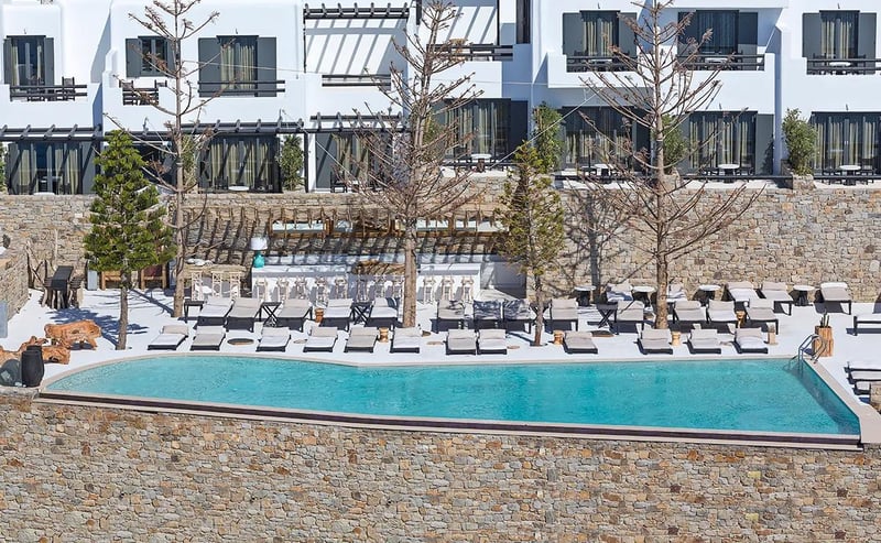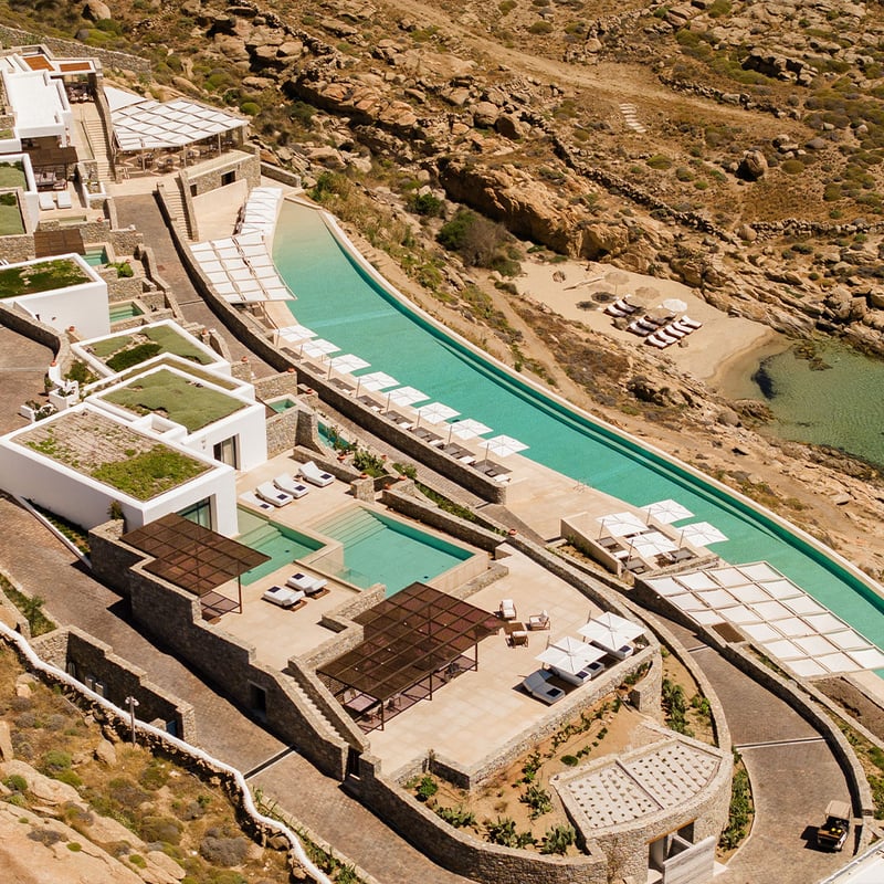 Low-slung Delios-stone buildings cluster beside Mykonos's iconic windmills, their Sixties-modern interiors glowing in Aegean light. Once a playground for the Onassis set, this renovated landmark now centers on a tranquil pool ringed by deep loungers and shaded alcoves with sunset views. The concierge arranges private boat excursions to uninhabited Delos, ancient Greece's sacred island—ideal for travelers seeking character and calm minutes from town.