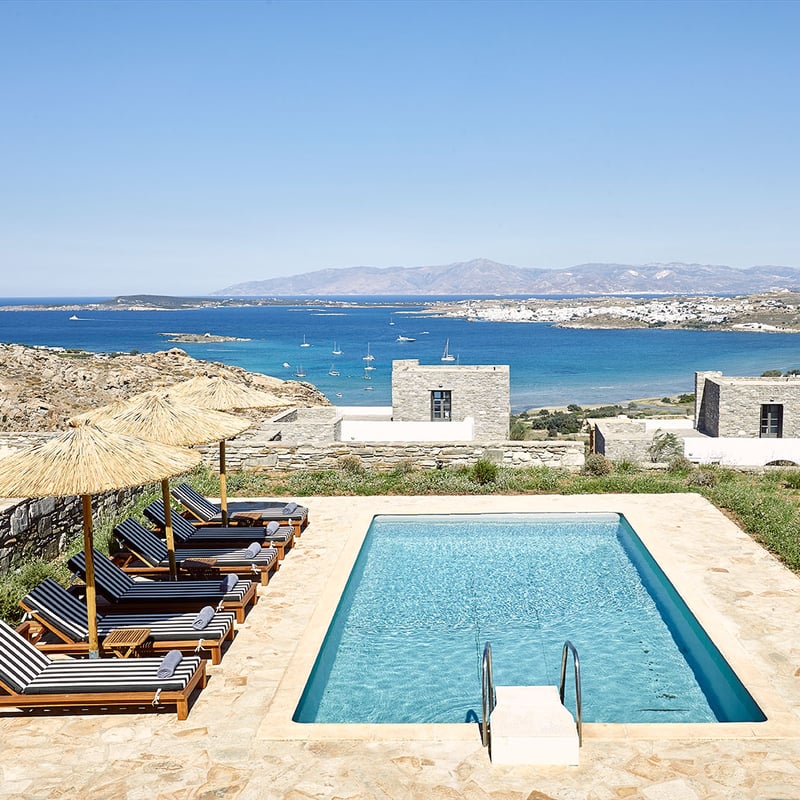 Whitewashed stone and minimalist Cycladic architecture define Parilio, a 33-suite retreat on Paros's northeast coast where terraces open to Aegean panoramas—some with private pools or jacuzzis. Pine trees shade the central pool, while the Elios Spa draws on Greek brands KORRES and Ariadne Athens. At Mr. E, chef Alexandros Tsiotinis plates Mediterranean seafood against sweeping sea views, completing an address built for unhurried coastal escapes.