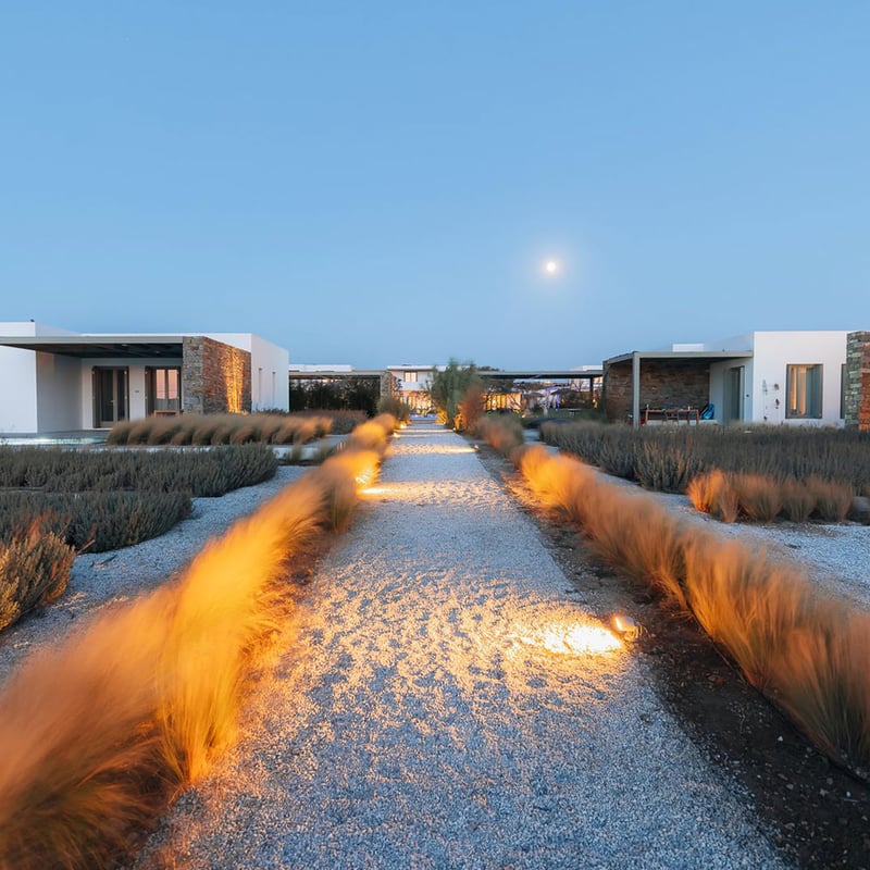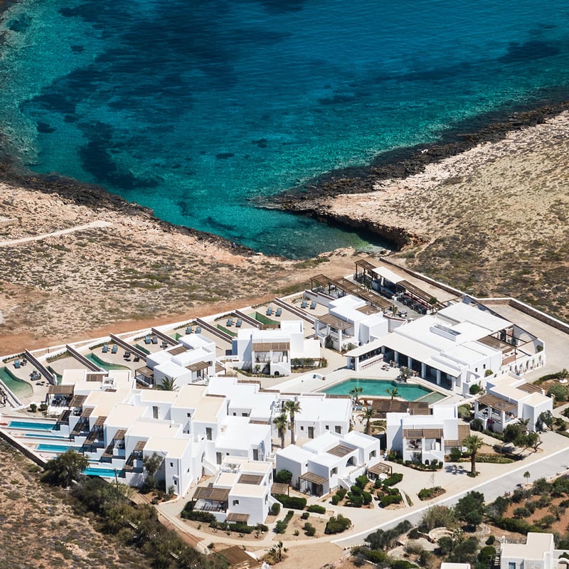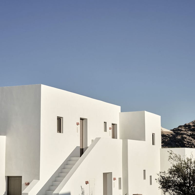 Above a sheltered bay on Paros's quieter western coast, this 44-room boutique hotel reinterprets Cycladic geometry through a Mediterranean lens—Athens-based designers drawing on Italian, French, and Moroccan influences. Many suites include private plunge pools; all open onto terraces facing the Aegean. The Lounge Deck delivers candlelit cocktails at sunset, while Olvo restaurant showcases chef Anastasios Tsantilas's modern Mediterranean cooking. Golden sand lies just 200 metres below.