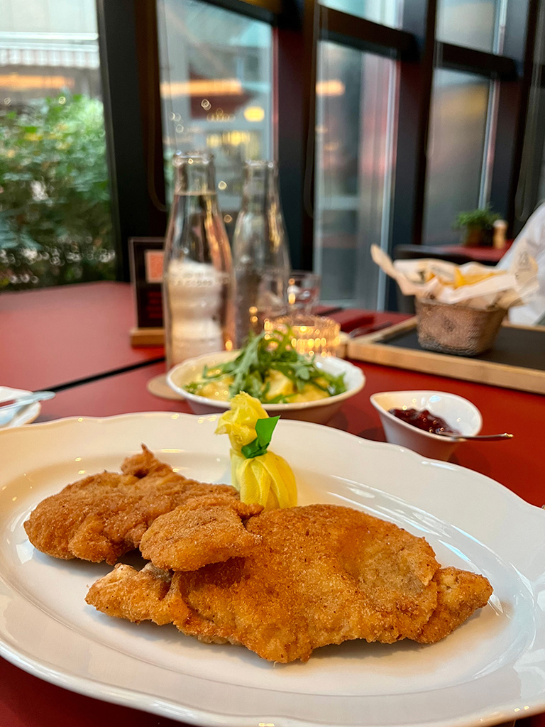 During our stay, we had the pleasure of dining at this restaurant and had a wonderful evening in complete relaxation. We started with a seasonal starter, roasted asparagus, before moving on to two dishes reflecting the essence of this place: a burger for my companion and a Viennese schnitzel for me. Both were delicious! For dessert, the pistachio sponge cake was perfect, although slightly too sweet for my taste.