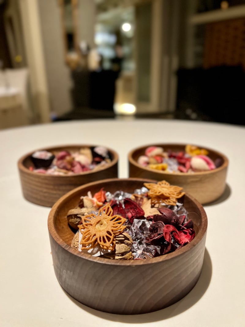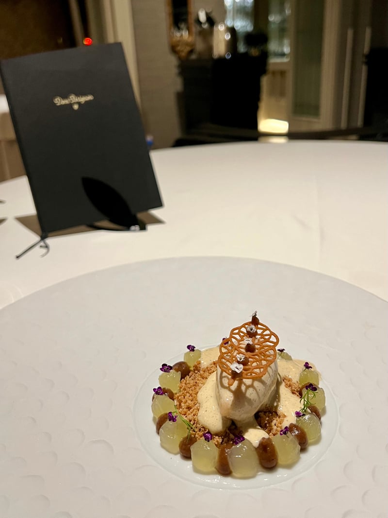 The dessert was a real pleasure, particularly with 'The Apple,' which finely marries raw and cooked apple, offering a comforting and delicate dessert. We were also eager to discover a more daring creation, combining coconut and caviar. It was a first for me to taste the combination of caviar with a dessert, and I must admit that the sweetness of the coconut perfectly complemented the saltiness of the caviar for a surprising and exquisite result. We concluded our meal with a selection of mignardises, putting a brilliant final point on this gastronomic adventure.