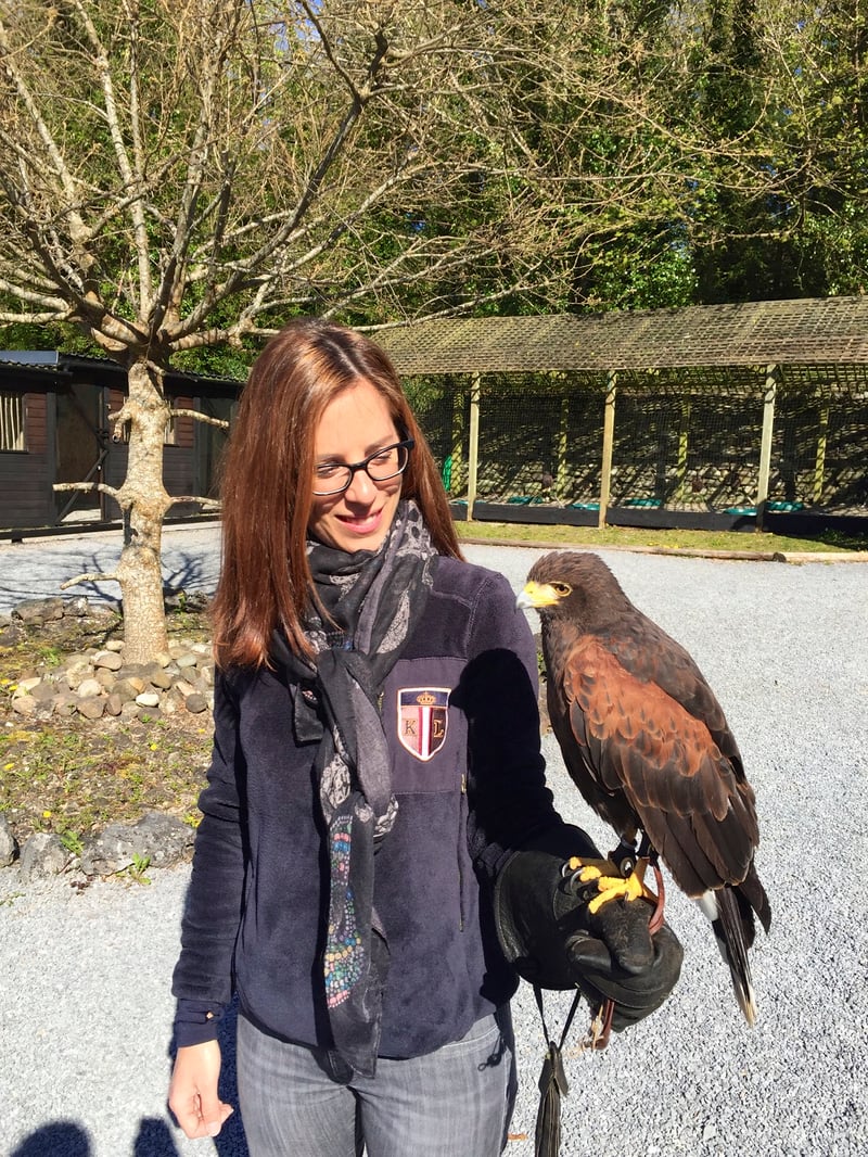First positive point : this is a private activity, meaning that this morning and for 1h30, it was only my husband and I in the company of our instructor who will explain to us the characteristics of these birds while having them fly. We each had a falcon with us and they followed us from tree to tree while we explored the Ashford Castle's park. From time to time, we called them and they would come and sit on our gloves (and fetch the little snack that we gave them in exchange) before flying off.