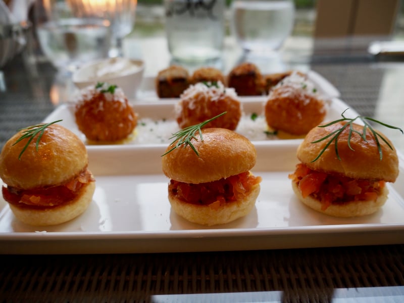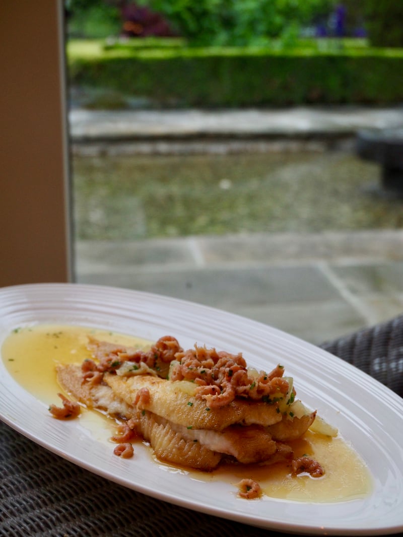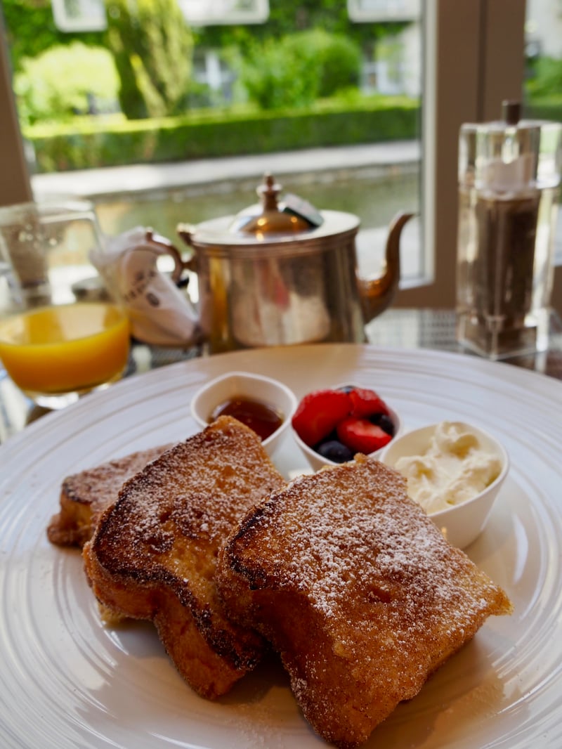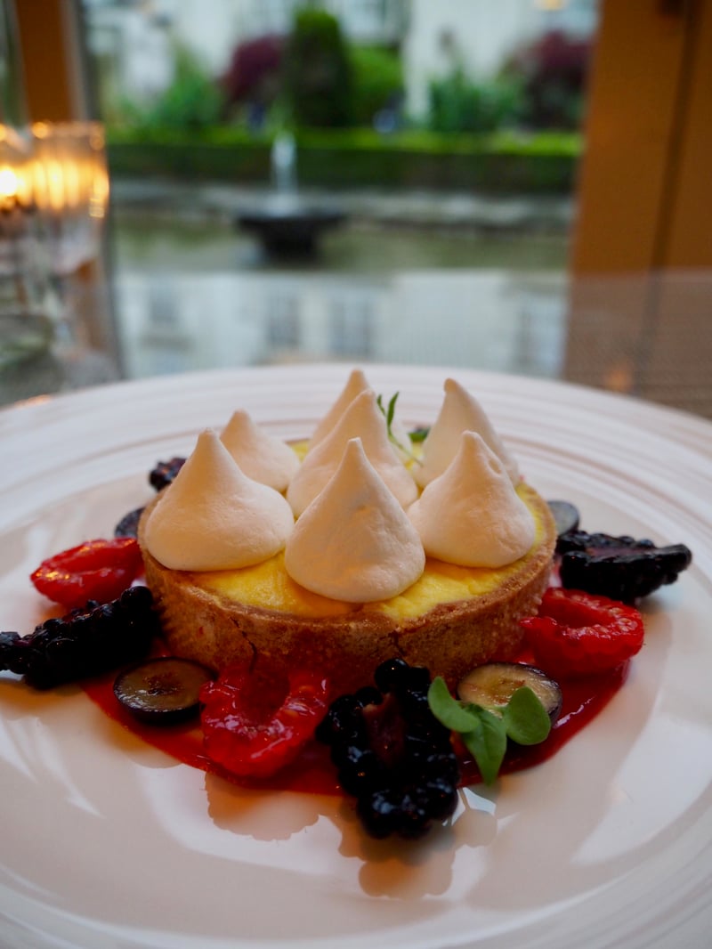 We had our hearts set on another restaurant—the Garden Room—with its brightly-lit, modern dining room and view overlooking the gardens. We kicked off our meal with a series of snacks, such as the gravlax bun with honey mustard sauce, beef casserole croquettes, and crab arancini with saffron aioli. My husband ordered the sole for his entree, while I chose the veal fillet with a Jerusalem artichoke puree.